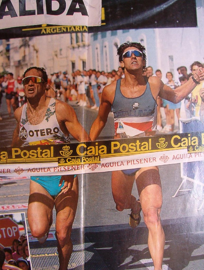Una foto muy señera de este triatlón puede ser esta, sprint entre Paco Godoy (padre de Cesc Godoy ) y Burgete, el Hippy en 1992