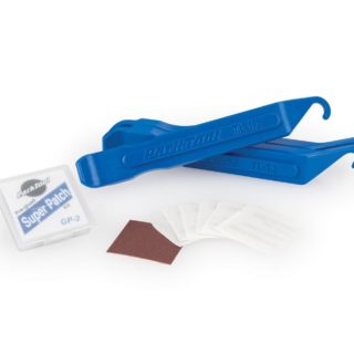 Dos desmontadores para la cubierta (yo prefiero tres) y kit de parches preencolados. Con esto si pinchas al menos puedes volver a casa.