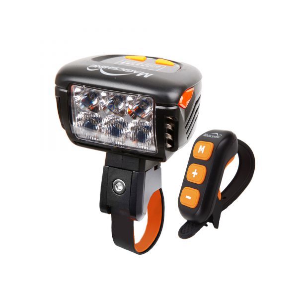 El foco delantero (MJ-900) fabricado en aluminio y resistente al agua tiene una potencia de 1200 lúmenes, impermeable y con un sistema de refrigeración en el exterior del mismo. La batería de este tiene una durabilidad de 2-3h. Tiene un peso de 72g y su anclaje es por medio de gomas, incluye un indicador led para avisar del nivel de la batería.