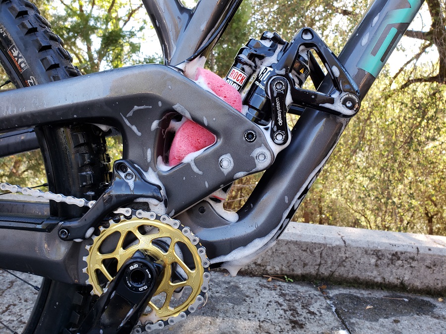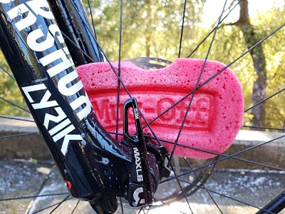 Usa la esponja rosa expansiva y / o el cepillo de lavado suave para limpiar la bicicleta como lo harías normalmente. La esponja es extremadamente útil para limpiar lugares de difícil acceso.