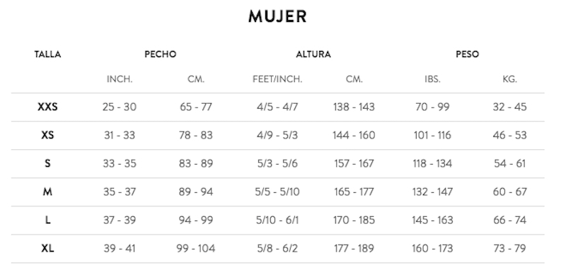 | Mujeres | Talla | Peso [kg] | Altura [cm] | Peso [lb] | Altura [ft] |