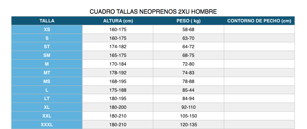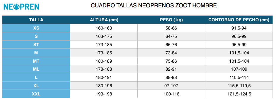 TABLA DE TALLAS NEOPRENOS ZONE3 HOMBRE :