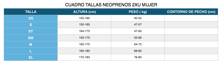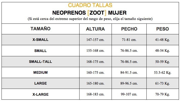 TABLA DE TALLAS NEOPRENOS ZONE 3 MUJER :